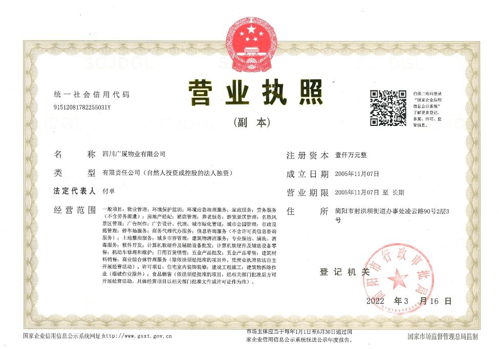 公司組織機制健全,內(nèi)設人事部、財務部、保安部、客服部、質(zhì)檢處,公司員工總?cè)藬?shù)200余人,管理干部40余人。上級母公司是四川廣廈,與其旗下的直飲水公司、電梯維保公司、裝飾裝修公司、土石方工程有限公司等形成相互合作、相對獨立的商業(yè)模式,在母公司及子公司的護佑下,廣廈物業(yè)日趨成熟和完善,打造酒店式的物業(yè)服務標準,給業(yè)主舒適愉悅的居住環(huán)境。